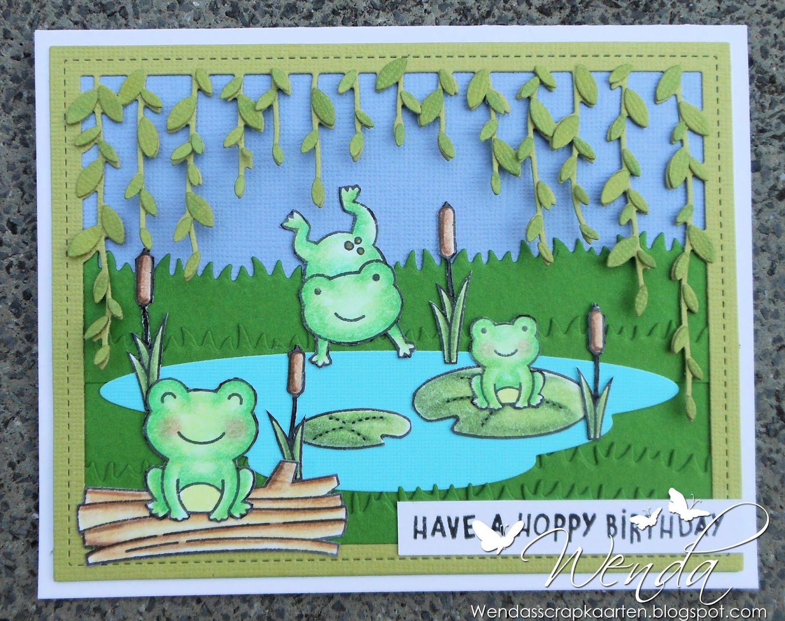 Je kan al een hele kaart maken met alleen de stans want daar zit ook een eendje bij en een waterblad, plantjes enz. maar ik heb gekozen voor deze gezellige kikkers.